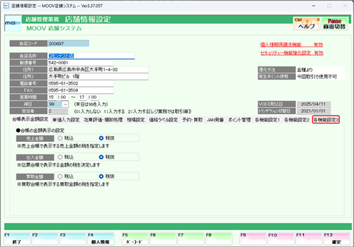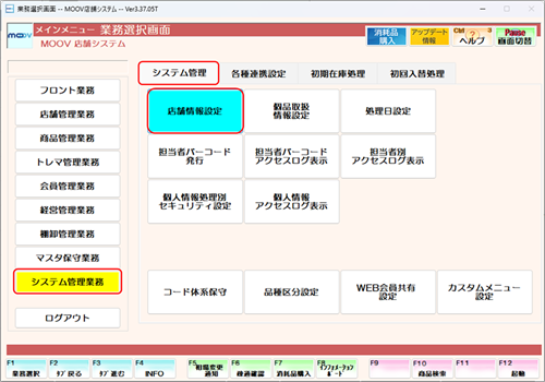 業務選択画面にて【システム管理業務】を選択し、【システム管理】タブ内の【店舗情報設定】を選択します。