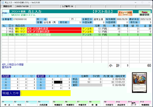 同じ会員様で同じ商品を過去にも売上入力した場合、タイトルが赤反転で明細表示されます。