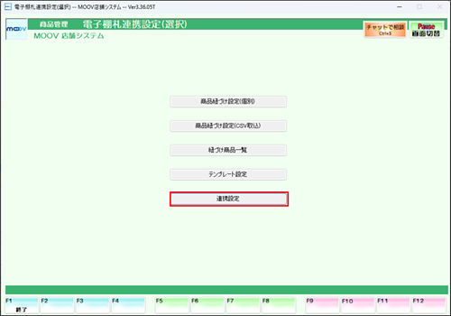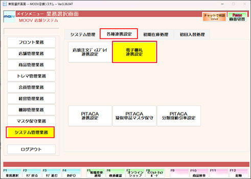 業務選択画面にて【システム管理業務】を選択し、【各種連携設定】タブ内の【電子棚札連携設定】を選択します。