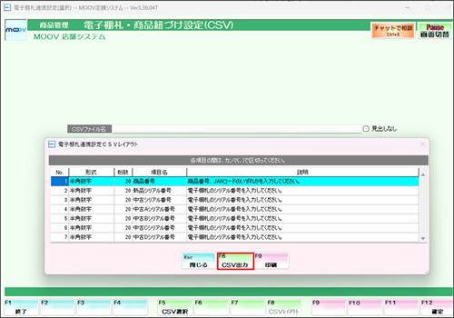 商品入力画面にて【F8:CSVレイアウト】を押下し、入庫CSVレイアウト画面にて【F6:CSV出力】を押下します。