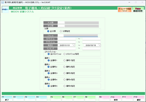 指定した条件で【F12:確定】を押下で、商品を抽出します。