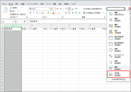 1文字目が0で始まる商品番号の場合、Excelで保存すると0が取り除かれる場合があるので必ず文字列に変更してください。
