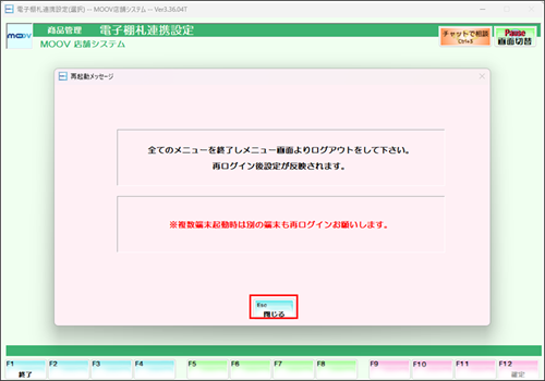 再起動メッセージにて【Esc:閉じる】を押下し、【F1:終了】を押下して連携設定を閉じます。