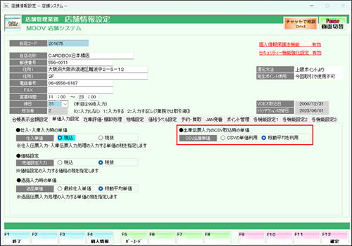 店舗情報設定の「単価入力設定」の「出庫伝票入力時のCSV取込時の単価」で、単価または移動平均単価のいずれかを選択できます。
